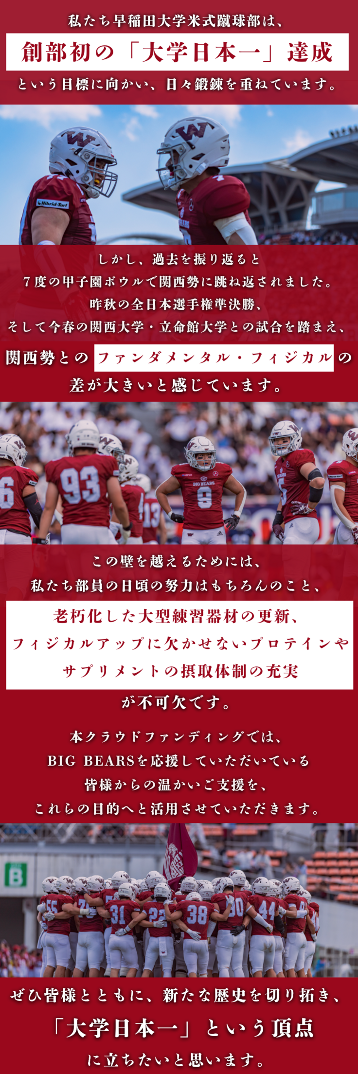 早稲田大学米式蹴球部において、第一目標金額:500万円までのご寄付では、関西勢とのファンダメンタル・フィジカルの差を埋め、追いつき追い越して行くために、練習器材の新調、栄養関係費の充実にあてます。第二目標金額:1000万円に向けていただくご寄付は、更なるファンダメンタル・フィジカルの強化に充てるほか、ユニフォーム更新費相当額を確保し、「ユニフォームレプリカTシャツ」の製作費の一部にもあてたいと思います。