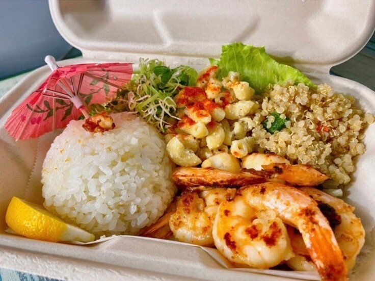 キッチンカーの料理は、体に優しいものや地元の食材を使ったフードメニューにこだわっています。ハワイの定番料理ガーリックシュリンプやハワイアンサンドウィッチなど提供しています。