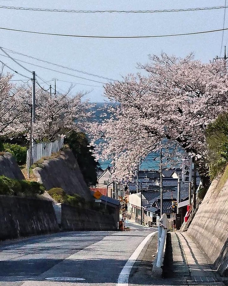 (春。名和神社からの参道。まっすぐ下った先が今回の出店場所。)