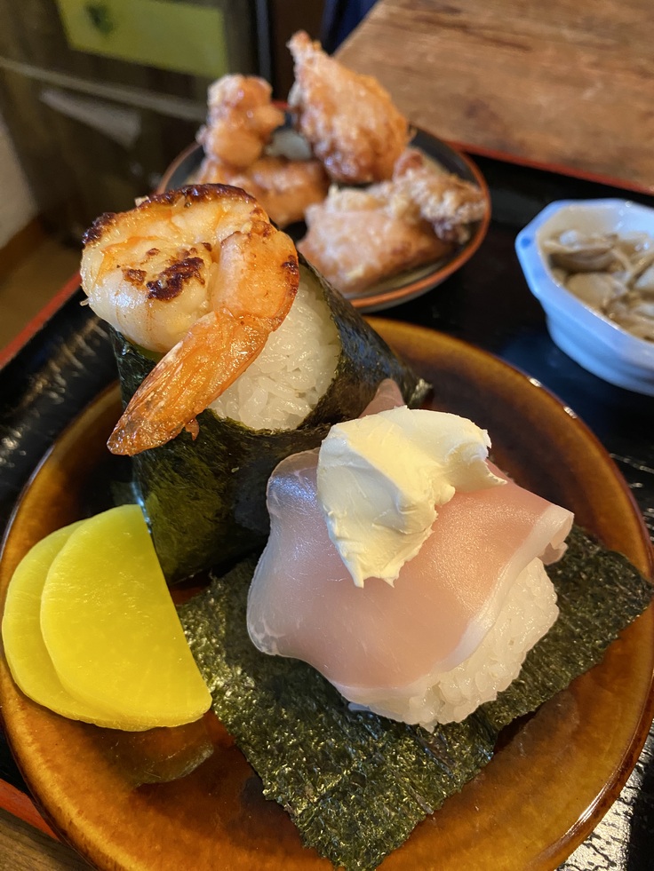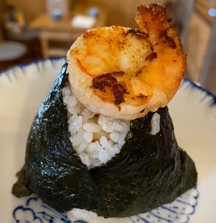 おにぎり君がにぎる、エネルギーがこもったおむすびとガーリックが効いたエビはもちろん、、