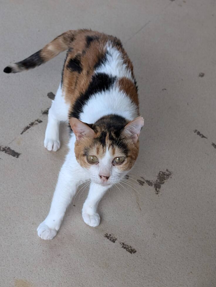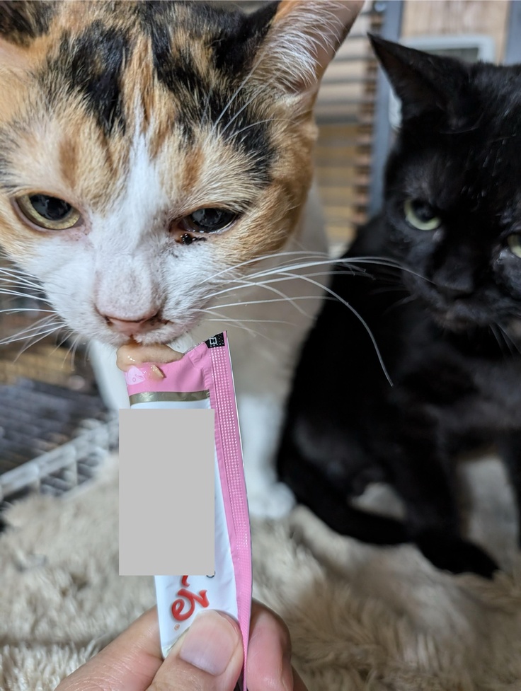 『三毛ばあ』の視線と小さく「にゃ…にゃ…」と呟く姿に、ついついおやつをあげてしまう私です(笑)