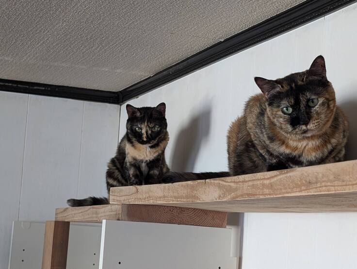 右側の素敵な棚も、いただいた不用品の棚板に穴を開けてキャットタワーにしました。