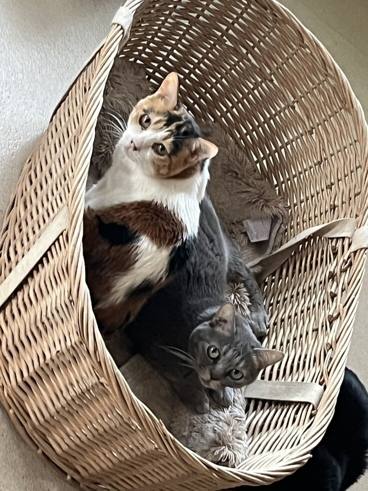 「不要になったから」といただいた大きなカゴも猫たちのお気に入りです。
