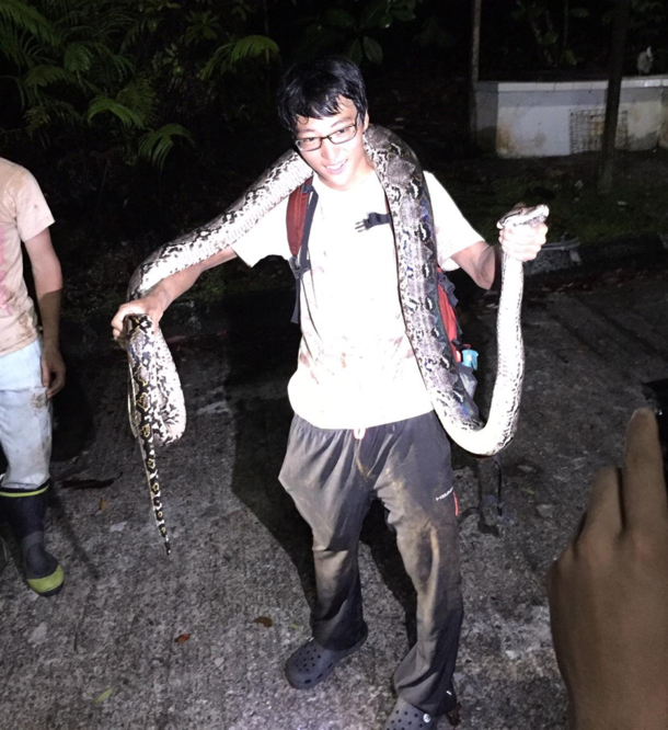 京都大学理学部4年。写真で背負っているのはボルネオのアミメニシキヘビ。ヘビに命をかけており、日頃から常識はずれの行動が多い。ヘビの行動について研究している。
