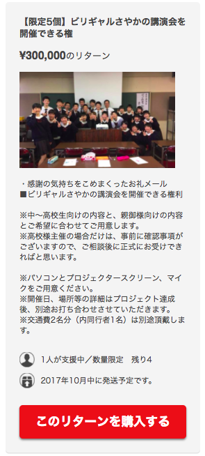クラウドファンディングとは、ネット上で不特定多数の方から支援を頂き、その資金でプロジェクトを実行するというものです。そして、そのリターンの中に30万円で講演会が実施出来るリターンが数量限定で用意があります。さやかさんの講演会は予約が殺到していて、なかなか呼ぶことが出来ません。この機会に是非静岡に来ていただき、無料で講演会を開催したい!と思っています。
