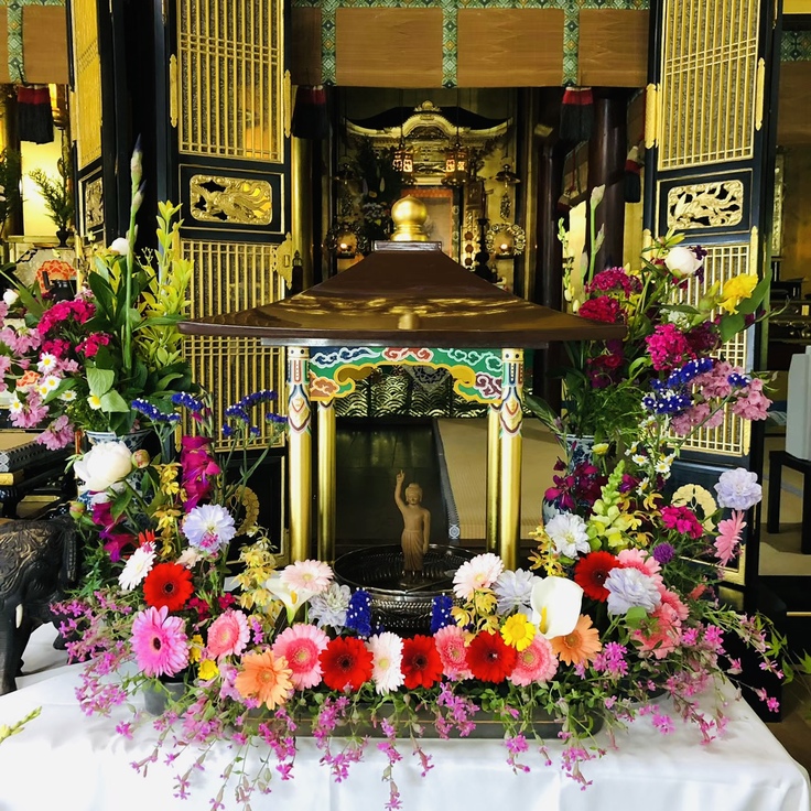 ⑴会場設営 お釈迦様のお誕生をお祝いするのに、本堂に花御堂を設置致します。 こちらのお花のお供え費用に当てさせていただきます。