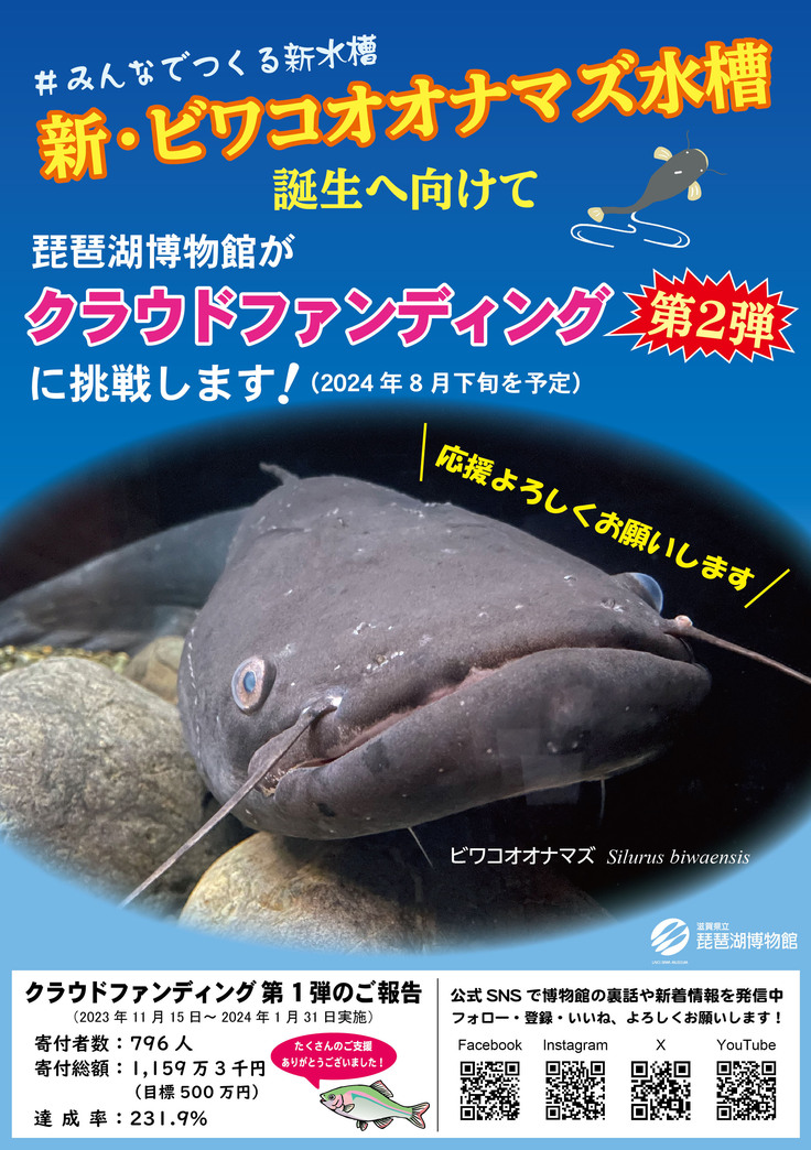 さて、琵琶湖博物館では、いよいよ「新ビワコオオナマズ水槽誕生へ向けて」クラウドファンディング第2弾を始動することになりました!随時SNSや新しいクラウドファンディング第2弾のサイト(近日公開予定)でも、情報を発信していきます。引き続き、皆様からのご支援、どうぞよろしくお願いいたします。