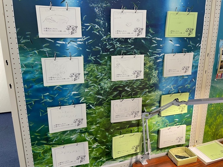 クラファン連動企画として行ったイラスト展に応募してくださった方々には、展示室を彩っていただきました。釣りをされる方からはぜひ展示に入れてくださいとビワコオオナマズをご提供いただきました。北船木漁協の漁師さんには、新コアユ水槽と一緒に展示する模型を1年間もかけて製作していただいたり、百瀬漁協の漁師さんには水槽内に使うエリの網や支柱をご提供いただいたり、写真撮影のために船を出してただいたり、モデルになっていただいたりしました。また、展示室にあった応援メッセージボードには、たくさんの方から応援の言葉が寄せられ、クラファン期間途中から館内に設置した募金箱にも多くの方からのご支援がありました。本当にありがとうございました。