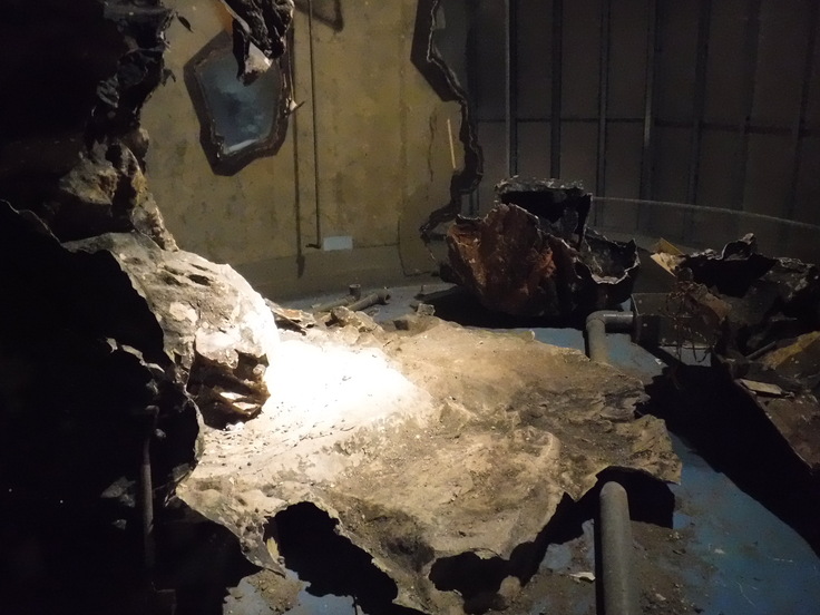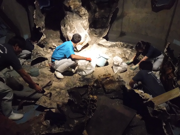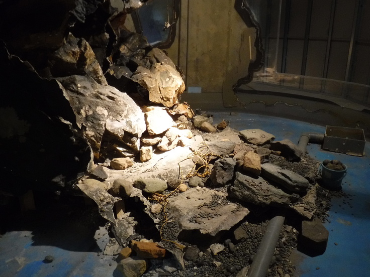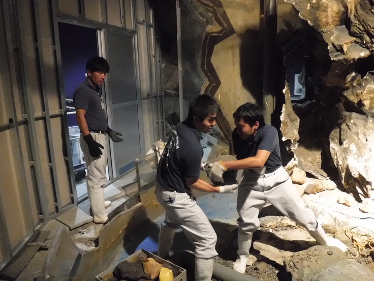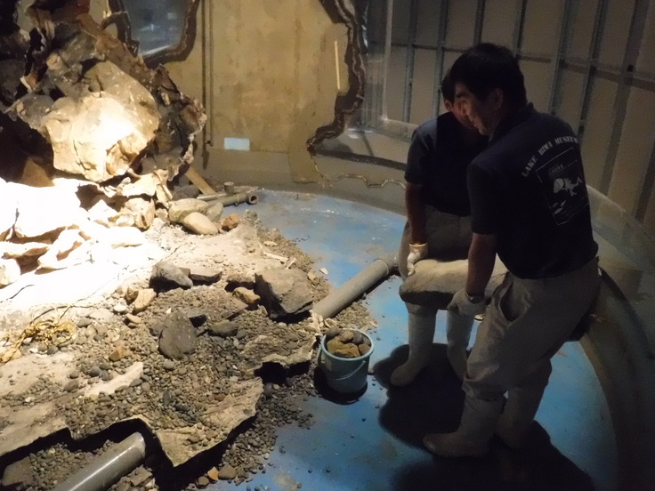今回の作業では、ビワコオオナマズ水槽の下に敷かれていた砂利や小石、岩を手作業で除去しました。中には、大人2人で何とか持ち上げられる大岩もありました。まだ、水槽の壁に接着してあるFRP(繊維強化プラスチック)製の擬岩(偽物の岩)は撤去できていませんが、着々と新水槽誕生の工事に向けて準備が進められています。