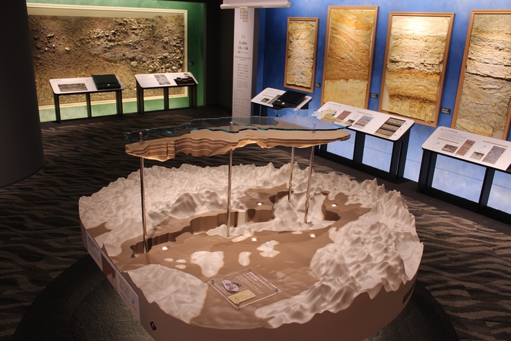 展示室の奥にはたくさんの地層が展示されています。これらは今の琵琶湖ができる以前の環境を教えてくれるものです。