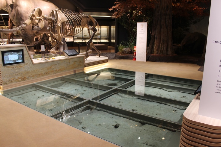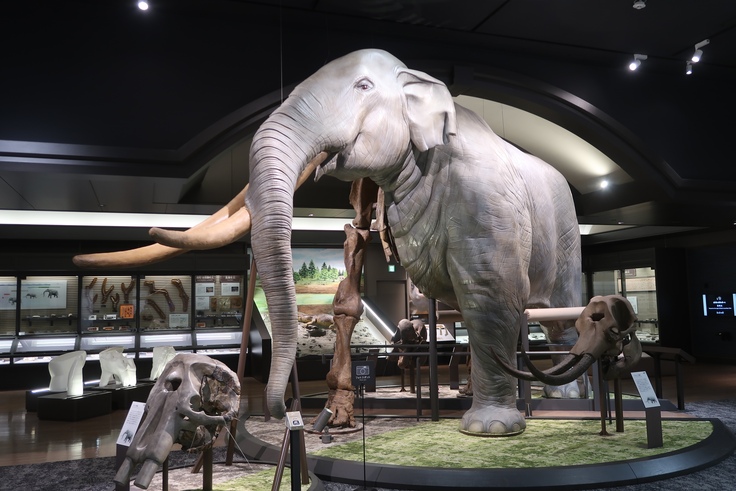展示室でひときわ目立つのは、ゾウ化石の骨格組み立て標本や足跡化石でしょう。ここでは今の日本列島にはいない種類の生き物が、昔の琵琶湖周辺にいたことを教えてくれます。