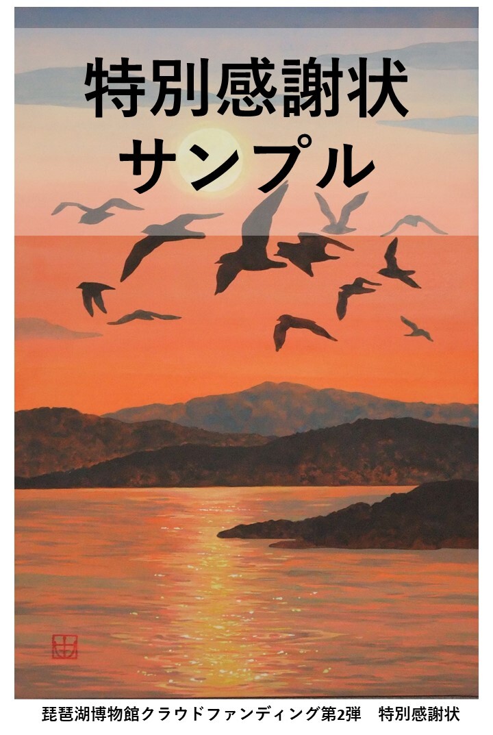 「特別感謝状 日本画家 村越由美子さん作」では、村越様の琵琶湖と夜明けを描かれた作品「黎明の旅立ち」が感謝状となります。