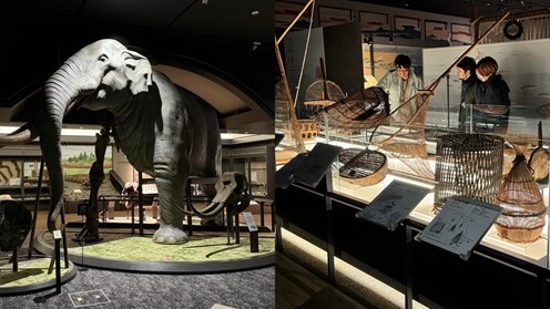暗い展示室に照らし出されるツダンスキーゾウ(左)と学芸員から国の有形民俗文化財に登録された漁具の解説を受ける支援者