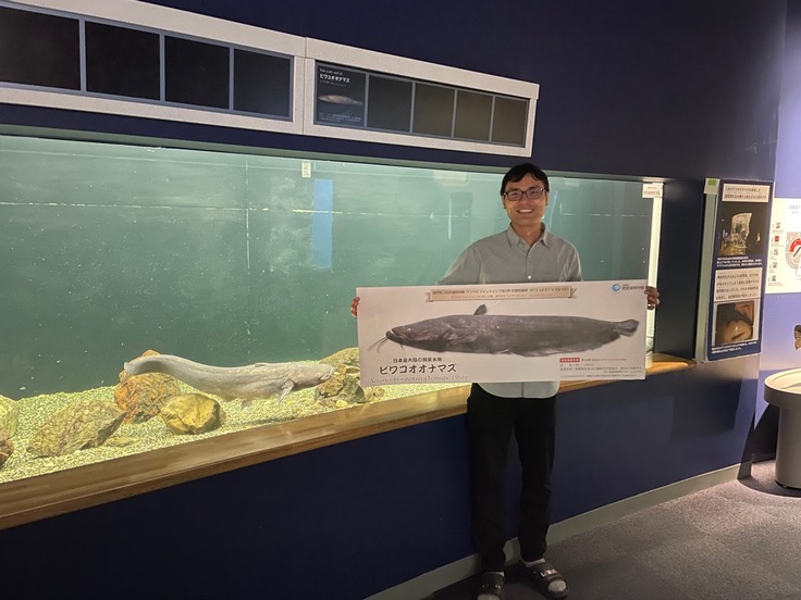 このポスターのためにビワコオオナマズの写真を新たに撮影しました。麻酔をかけてしまうとナマズに負担がかかるのと、ヒレをうまく撮影することが出来ないです。そのため、水槽内で泳いでいるところを撮影する必要があり、学芸員が水槽の前で長時間粘り、撮影に成功しました!
