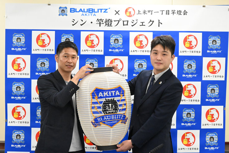 上米町一丁目竿燈会より貴志冬樹代表、ブラウブリッツ秋田からは岩瀬浩介代表取締役社長が出席しました。