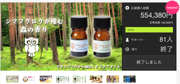 そんなとき、大阪で開催されていたギフトショーに出展されていた、アロマオイルの製造会社、グラース株式会社様と巡り合うことができ、シマフクロウのための活動をする足がかりができることになりました。