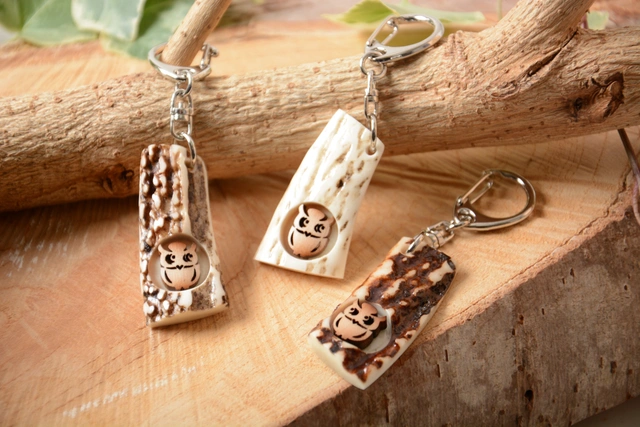 「北海道に生息するエゾ鹿の角でできたフクロウの木彫りキーホルダー」天然のシカの角を使って作っているため、一つ一つ形の異なる世界にたった一つだけのオリジナルアイテムです。