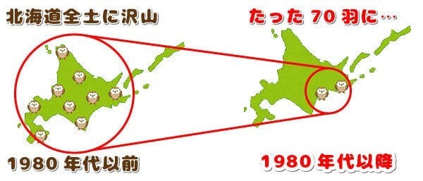 現在では北海道の東部を中心に北海道本島の生息数は約100つがい、約160羽までその数は回復していますが、
