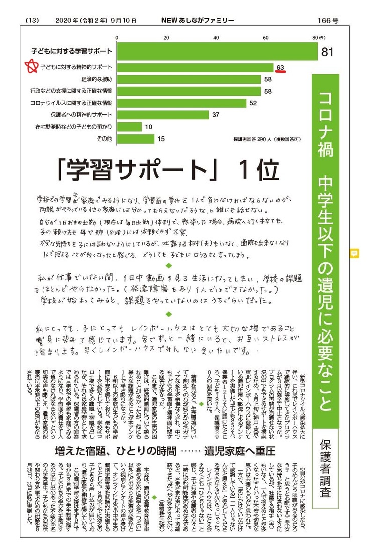 「あしながファミリー」新聞のアンケート結果に示されたとおり、遺児たちにとってレインボーハウスは心の支え、「ひとりじゃない!」と感じられる「場」です。