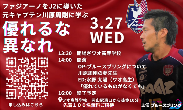 登壇するのはブルースプリングのメンバーの一人である水野と、プロサッカークラブファジアーノ岡山の元キャプテン、川原周剛さんです。