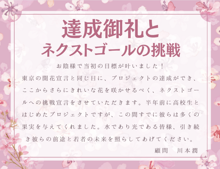 こんにちは、ブルースプリングCOOの大西奈菜子です。3月29日に終了まで約50時間を残して目標金額100万円を達成いたしました。ご支援ご協力いただいた皆様、見守っていただいた皆様に、ブルースプリングメンバーを代表し心より御礼申し上げます。本当にありがとうございます。