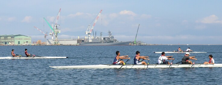 フェリーや貨物船の合間をぬってのトレーニングです。