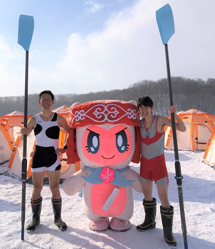 ちなみに真ん中は、小山先生と一緒に大会準備をすすめる、網走市のキャラクター、アカネ色のニポポこと「ニポネ」です。ニポネの北海道インターハイ広報活動にも期待してください!