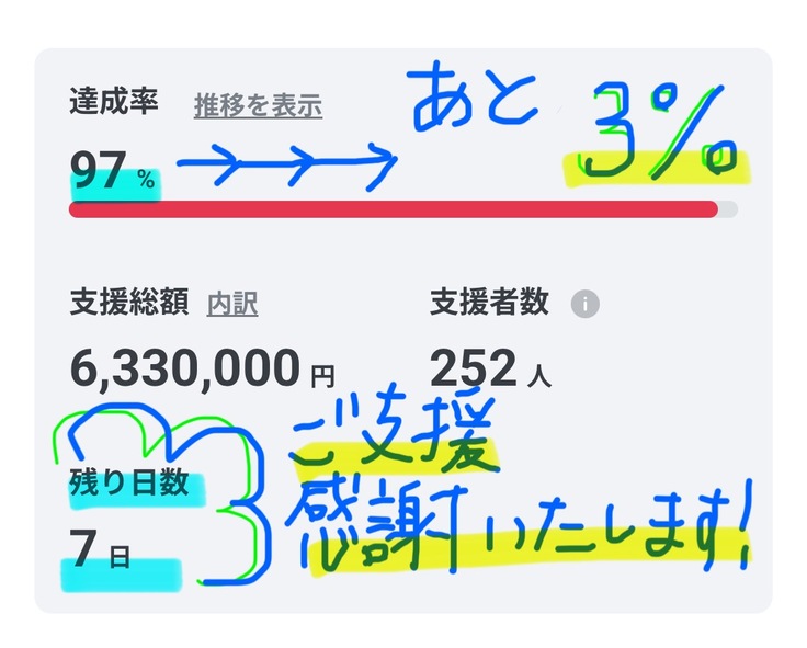現在達成率まであと3%!まできており、取り急ぎご報告を
