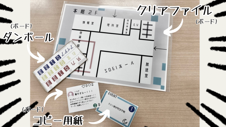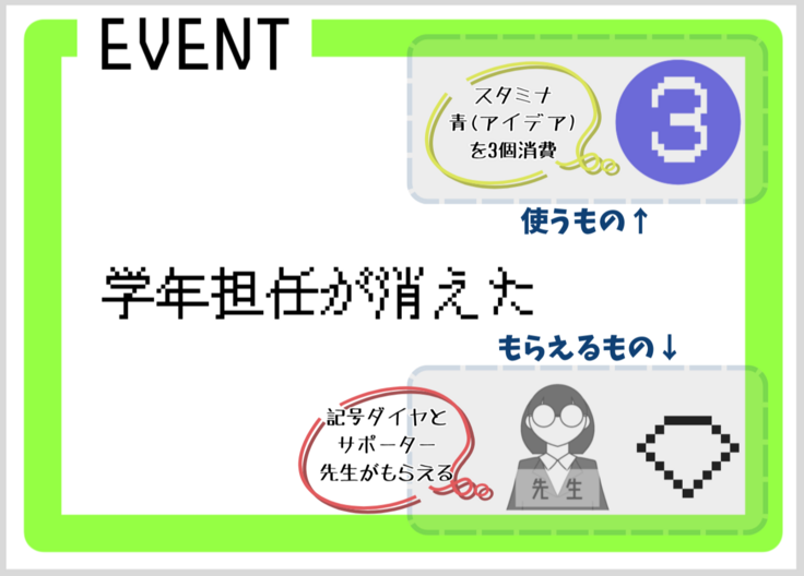 スタミナ(努力、お金、アイデア)を使って「イベント」を、その記号と数で「クレーム」を解消できます。イベントやクレームを解消して生徒からの支持を一番集めた人が勝ち!でもスタミナは3つずつしかありません。0になったら一回休みです。さぁ、あなたは改革を無事に遂げ、生徒会長になることができるのでしょうか?