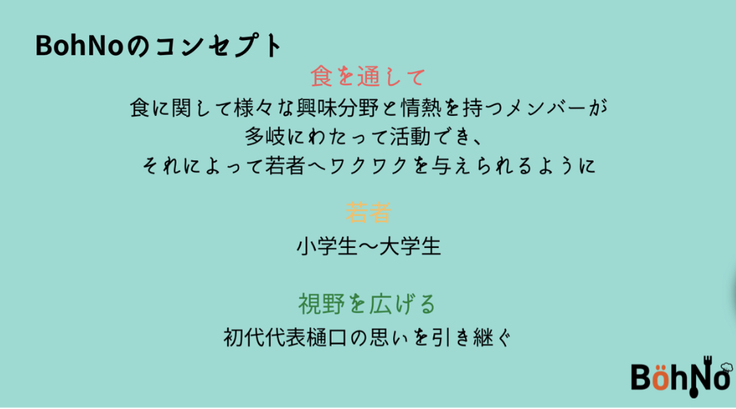 食を通して: 食に対して、様々な興味分野と情熱を持つBohNoメンバーが多岐に渡って活動でき、それによって若者へワクワクを与えられるように❤️🔥