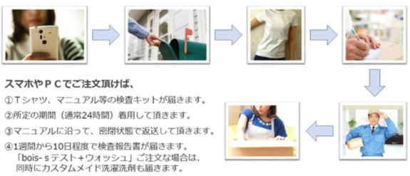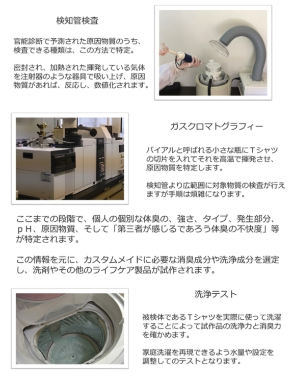 今回行われる実験では、有志のサンプル提供者(家族、知人)に「bois-sテスト」の実売時と同様の手順で、サンプル衣類の提供を依頼し、それを利用して各種データ収集方法の確立と各種データ収集を行います。そしてその後、サンプル衣類及び体臭物質試薬を使った、各種体臭成分に対しての洗浄成分の同定を行う予定です。