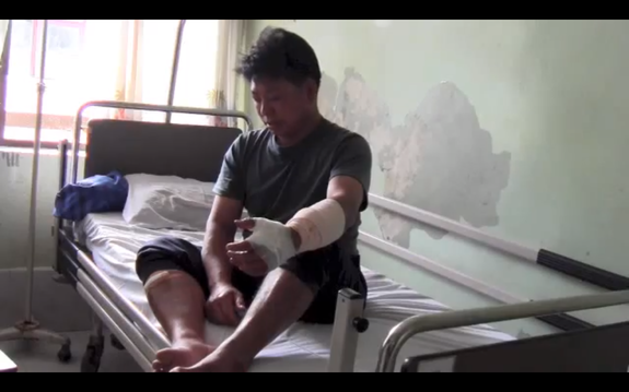 (写真:2013年2月シエンクアン県立病院 不発弾被害にあって治療をうける男性)