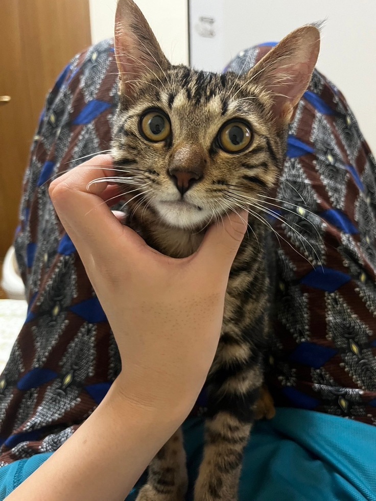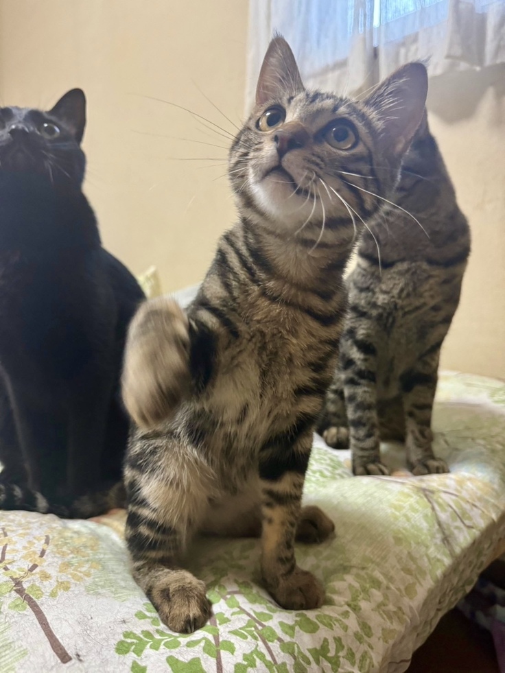 隔離期間を終え、猫社会にも馴染ませる為、4歳2匹、2歳1匹の我が家でも1番優しい子がいる部屋に入ってもらいましたが、お兄ちゃん達に何をされても、めげずに「あそんでー」を繰り返し、お兄ちゃん達も諦めて受け入れてくれました。