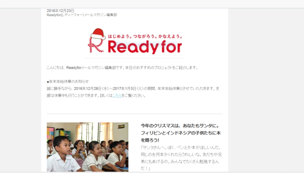 きょうの夕方、Readyforさんがメルマガで、現在公開中の私たちのプロジェクトを紹介してくださいました!