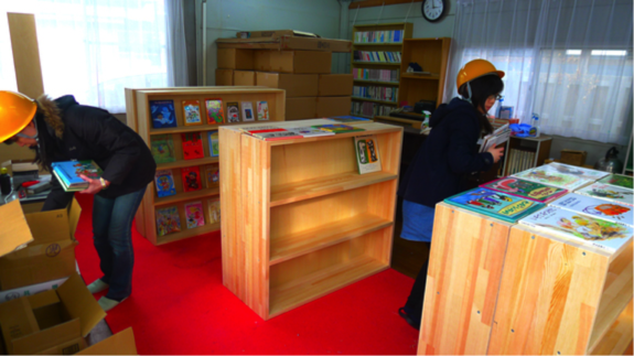 東日本大震災の発生後、宮城県教育委員会からの要望を受け、2011年秋頃から石巻市に図書センターを開設し、読書環境の復興の支援を実施してきました。また、宮城・岩手両県の保育所や小中学校へ、北海道からのボランティアが交代で滞在しながら約1年半に渡って支援を続けてきました。さらに、津波によって図書館が壊滅した岩手県陸前高田市では、「仮設市立図書館を寄贈するプロジェクト」を起案し、自主バザーなどで資金を調達しながら、のべ60人の建設ボランティアの協力を得て図書館を建設し、同市に寄贈しました。これまで、被災地の子どもたちからは、「本を読む時間が一番楽しい。いっぱい本を持ってきてくれて、とてもうれしい」という声も頂いております。現在でも毎月、札幌から東北を訪れ、岩手・宮城・福島を移動しながら、読書環境の整備支援を進めています。