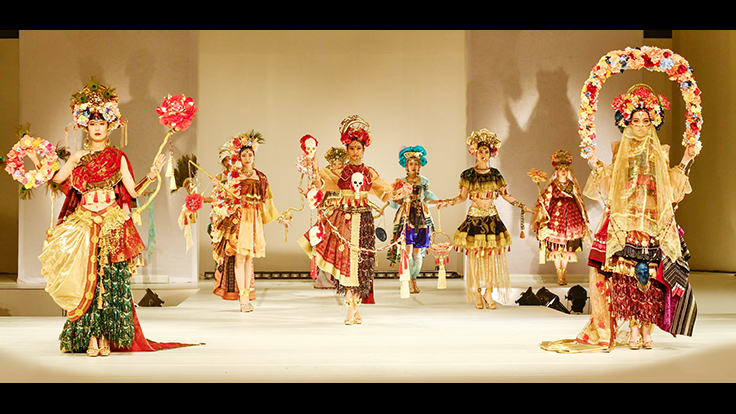 インドの伝統織物「イカット」などを活用し、東京のファッションデザイナーによってデザインされる衣装が舞台を彩ります。