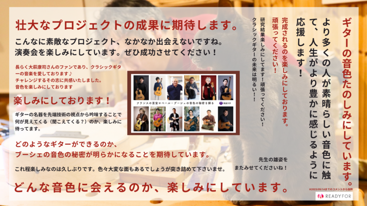 2023年9月15日の夜11時、目標の112%に到達し、無事に募集を終了することができました。ご協力いただいた皆様に心からお礼申し上げます。この1ヶ月半、熱くて暑い(本当に暑かった!)夏でした。昨日は放心状態で1日が過ぎてしまいました。プロジェクトはこれからがスタートです。心機一転この風変わりな研究を成功に導くべく邁進してまいります。研究に関してはいつも自信満々な私ですが、今回は資金を提供していただいたみなさんのお顔が思い浮かびながらのスタートで、いつもとは自然と違った心持ちではあります。このいい緊張感をエネルギーに変えて困難があっても乗り越えて行きたいと思います。節目節目で研究・教育・開発の進展をご報告いたします。研究現場の臨場感をお楽しみいただきながら、コンサートシリーズやCDをお聴きいただけたらと思います。最後に、常に辛抱強く励まし、アドバイスをくださったREADYFORの担当者の方々にもこの場を借りて感謝いたします。写真はREADYFORの担当者が作成した印象的なコメントの寄せ書きだそうです。読むと本当に励みになります。今後とも温かい応援をよろしくお願いいたします。