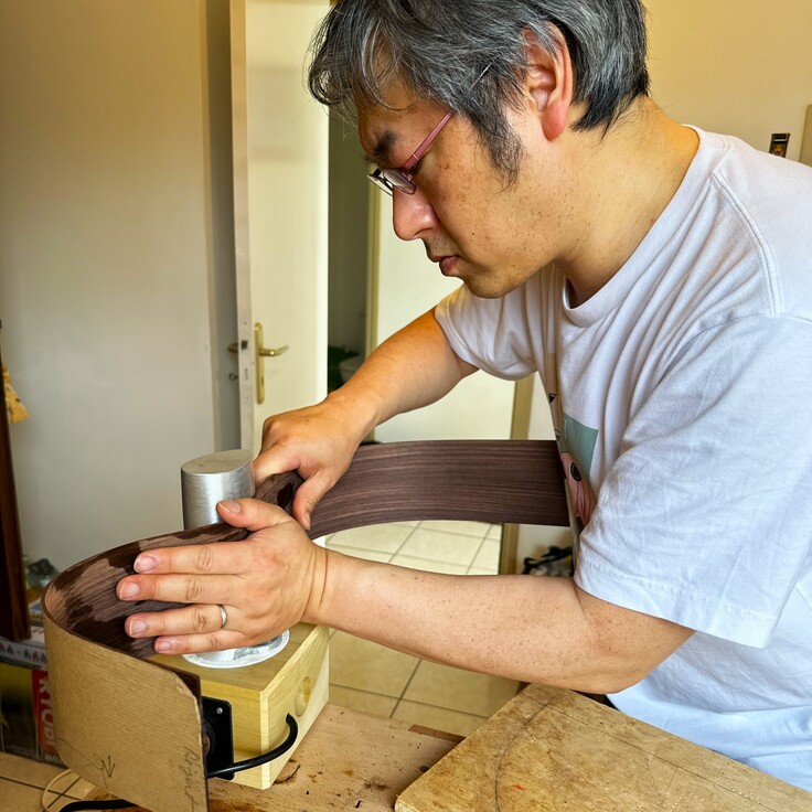 2月初旬に2本のネックともフット部分を作り終えたのち、サイドを曲げる作業に入った。写真の日付を見ると2月14日、バレンタインデーとなっている。この作業は、始めるときの心理的ハードルが一番高いものの1つだった。これまではホイル蒸しのような形で温め、そのままギターの形をした型に押し当てる方式で曲げていた。マゼさんのところでは伝統的なベンディング(曲げ)アイロンに直接当てて少しずつ曲げていく方法。今は電熱器で筒が温まる普通のアイロンだが、昔はパイプの中に100Wの電球を2つ入れたり、ブーシェさんだと内部がガス・バーナー状になっていたりと過激なものが多かったそうだ。マゼ方式では片面に紙を貼り、ここをもう少し曲げる、とか、ここをもう少しまっすぐに戻す、とかいったことを鉛筆で書きながら作業する。ミリ単位で曲げていくので型に合わせたときに思ったことをアイロン作業中に思い出すのは結構難しい。メモしながら進めていく。マゼさんは、今では午前中に右と左の両方の曲げを終えてしまうそうだが、私は曲げたり戻したり、いろいろやっているうちに丸2日かかってしまった。それでも片方が1日半、2枚目は半日で終わったのでコツを掴むのに結構時間がかかったことになる。