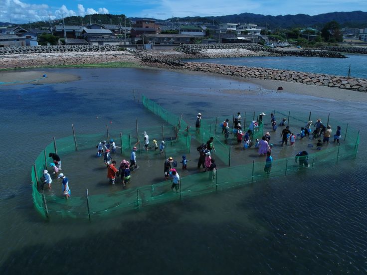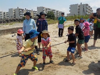 7月~8月に簾立て漁や地引き網漁など漁業体験を行います。また、講師の先生をお招きして、タッチングプールでの魚の観察や浜での生き物観察も実施しています。大人も子どもも一緒になってみんなで楽しんでいます。