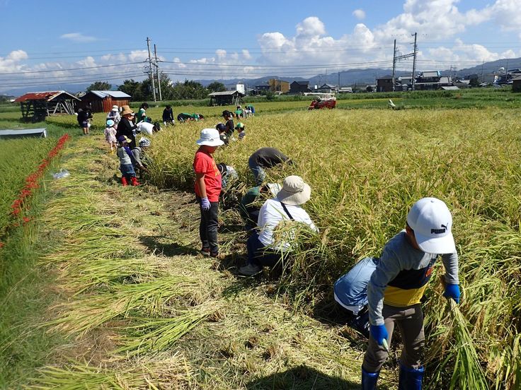 9月ごろに地域の方の指導・サポートを受けて行います。親子が組になり、鎌を用いて刈りとります。バッタなどの昆虫が飛び出てきて網を持って追いかける子どももおり、秋の田んぼを楽しむことができます。