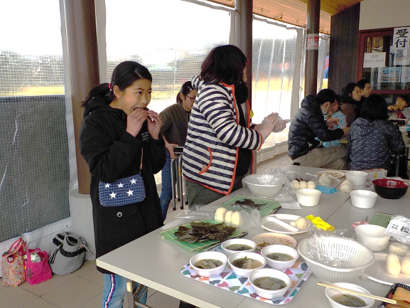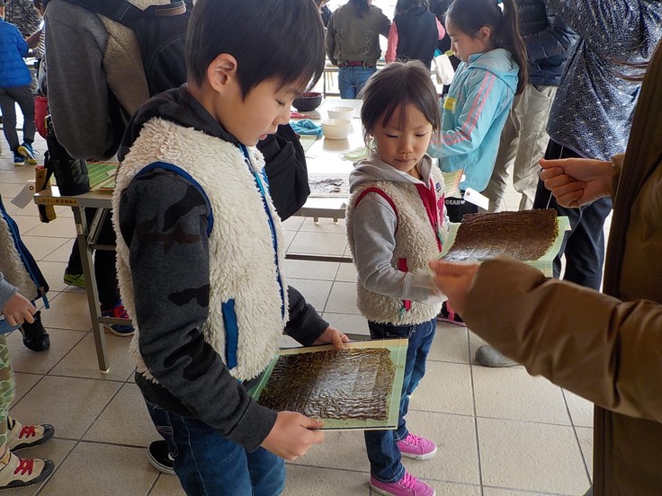 1月~2月ごろに西鳥取漁港にて海苔の摘み取りと前回作成したすき枠を用いた海苔すきを行います。海苔をすいて干せば、世界に一つ自分のデザインした海苔の完成です。