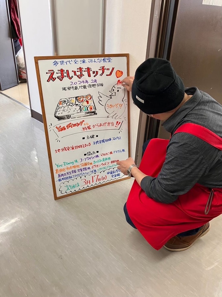 大手企業のデザイナーとして働きつつ、いつも「えまいまキッチン」では遊び場だったり、ホワイトボードのイラストだったりを担当してくれております。
