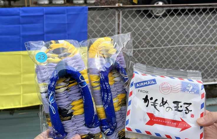 私は、ウクライナカラーの「布ぞうり」と岩手県大船渡市の「かもめの玉子」というお菓子があったので、購入いたしました。