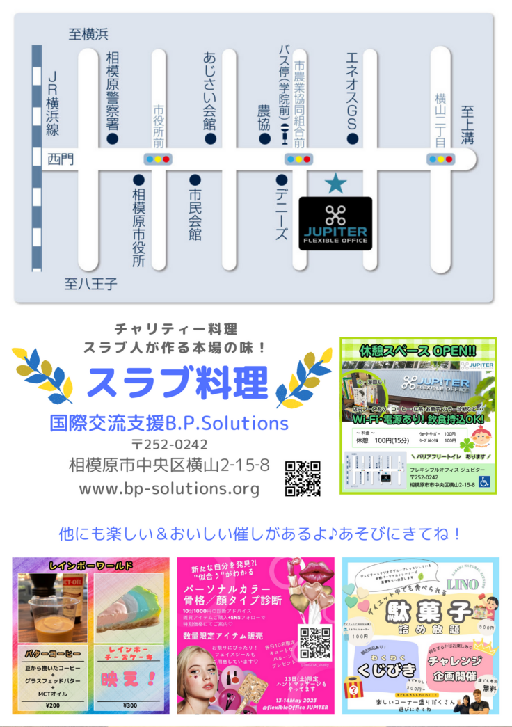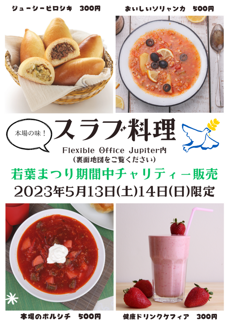5月13日(土)12:00~17:00、5月14日(日)10:00~17:00に、相模原市フレキシブルオフィスJupiter内にて、チャリティースラブ(ウクライナ)料理の販売イベントを行います。