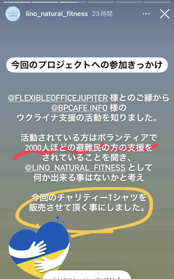 本日は、相模原市内のパーソナルフィットネスジムLINO様が企画してくださったウクライナ避難民支援チャリティTシャツをご紹介いたします。