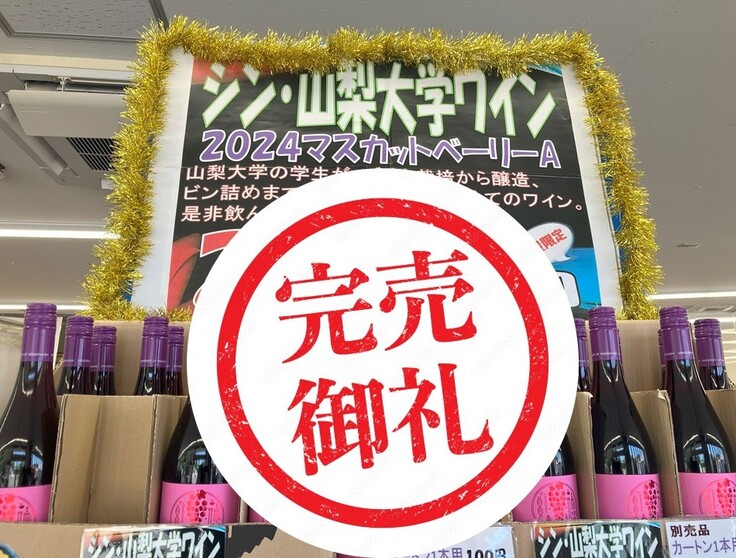 おかげさまで、ローソン山梨大学店様にて販売していただいた「シン・山梨大学ワイン2024 マスカットベーリーA」が、完売いたしました!