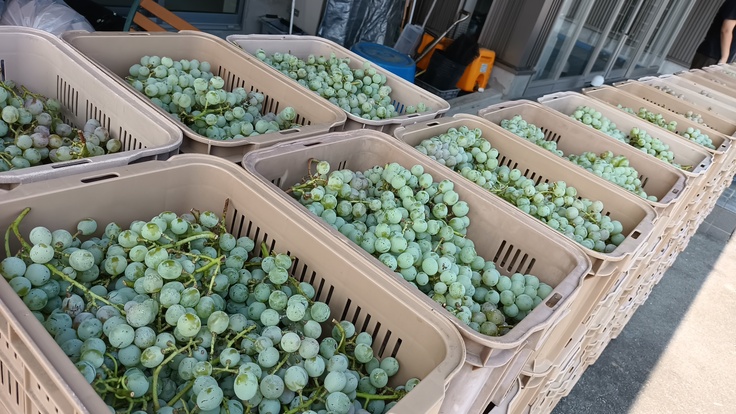 まだ青い甲州ブドウ。ブランデー原料は低糖度の甲州、これです!