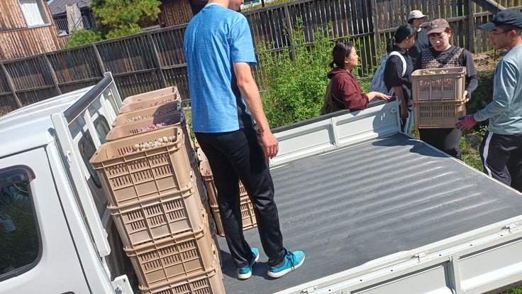 学生たちは、畑で丁寧に収穫したブドウたちをトラックへ積み込み、ワイン科学研究センターの工場まで運んでいきました。
