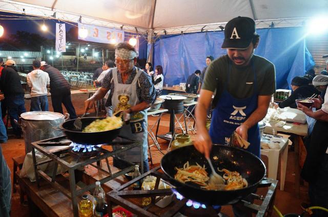 先述のように、日系人がたった200人という小さな村ながら、地元の人たちの力だけで櫓を建て、手作りの提灯やのぼりを飾り、村人のバンドが生演奏で盆踊りを盛り上げます。日本の食材が揃いにくいブラジルにおいて、苦心しながら材料を集めることから始まり、うどん、焼きそば、たこ焼き、かき氷、おにぎりなどの多くの日本の食べ物を取りそろえた屋台が並びます。