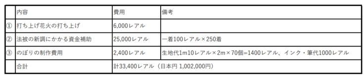 第一アリアンサ村開拓100周年記念盆踊りで、花火の打ち上げ(6,000レアル)、法被の新調(25,000レアル)、のぼりの作成(2,400レアル) 計33,400レアル(1,002,000円)に使用します。